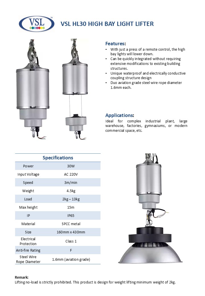 Hygrow Sdn Bhd Products VSL HL30 HIGH BAY LIGHT LIFTER