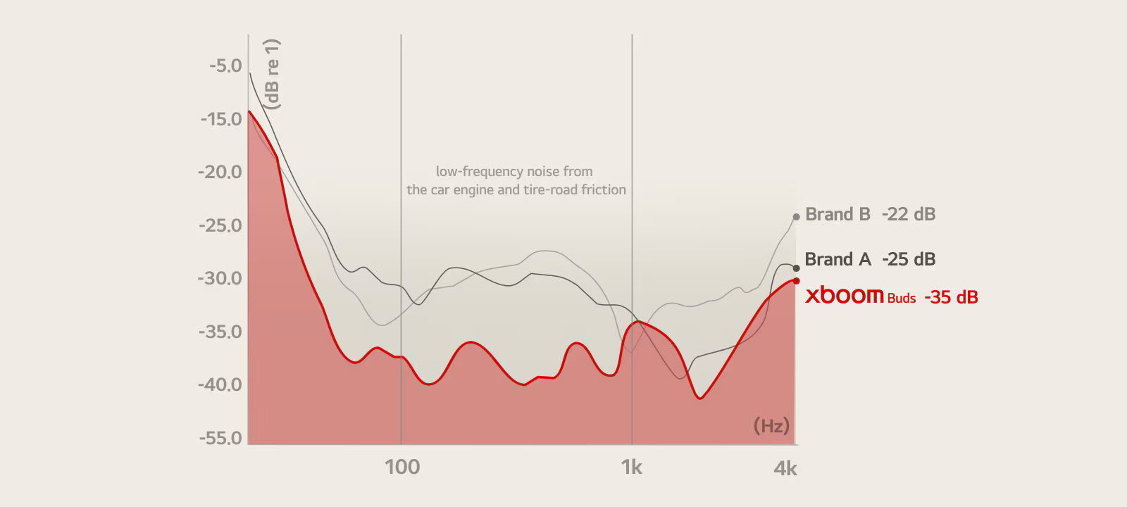 Comparison of low-frequency noise cancellation performance between xboom Buds and other brands.