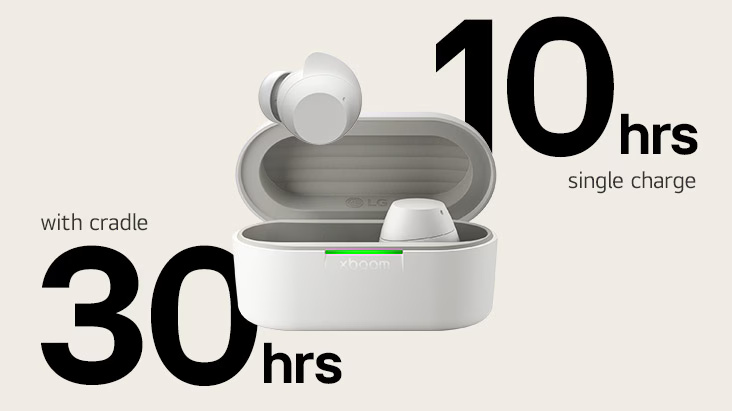 Up to 30 hrs total (10 hrs earbuds + 20 hrs charging case).