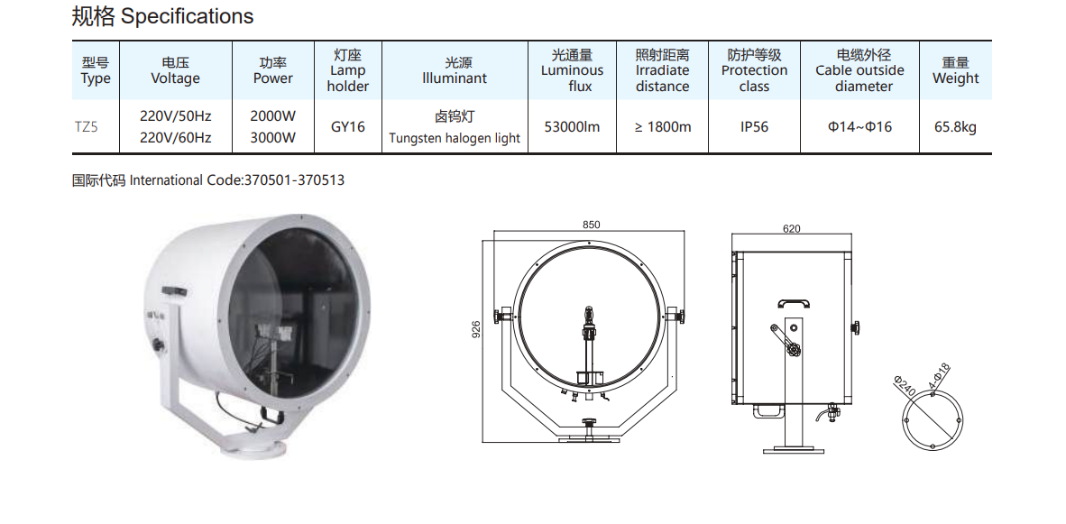 Operating at 220V, the JLUX TZ5 search light is available in 2000W and 3000W power configurations, delivering brightness output of 53,000 lumens for effective long-distance visibility. This high-intensity lighting performance makes it suitable for demanding marine environments where powerful directional lighting is essential.