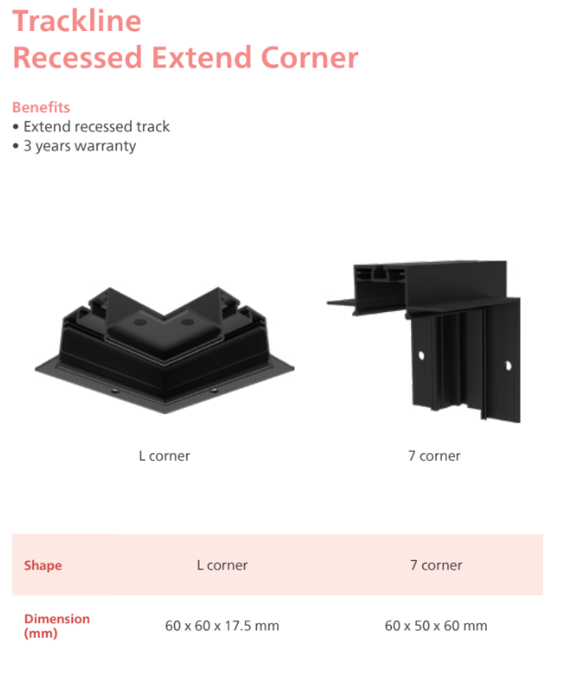 The (NEW) PHILIPS TRACKLINE RECESSED EXTEND CORNER [L-CORNER/7-CORNER] is ideal for creating continuous lighting layouts in both residential and commercial spaces. Available in L-Corner and 7-Corner configurations, it provides flexibility to suit different ceiling designs and track arrangements, ensuring smooth directional transitions.