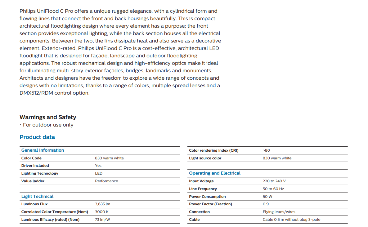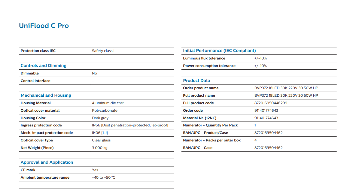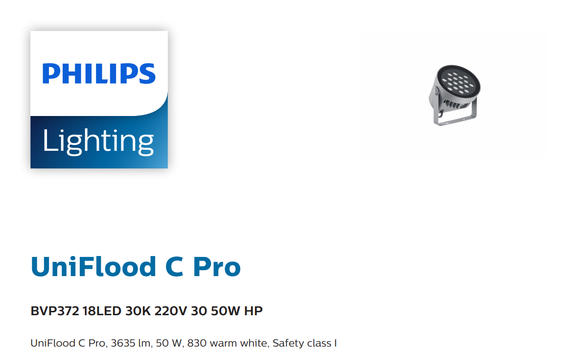The PHILIPS BVP372 UNIFLOOD C PRO LED FLOODLIGHT 240V 50W 3,635LM 3000K IP66 CRI80 (911401774643) is an ideal choice for users looking for a durable, energy-efficient, and high-quality floodlighting solution backed by Philips reliability.