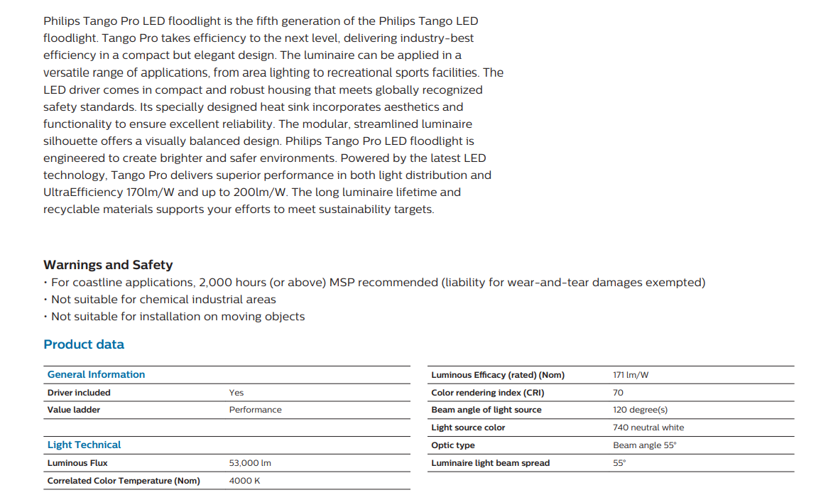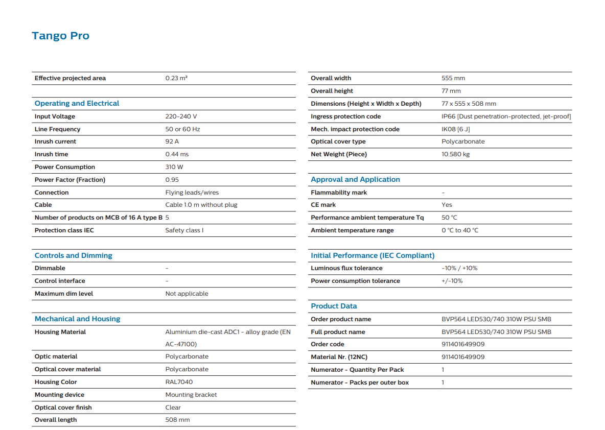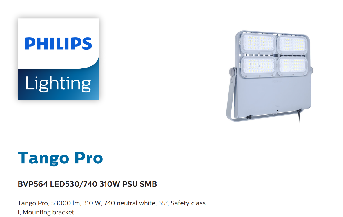 The PHILIPS BVP564 LED530/740 TANGO PRO LED FLOODLIGHT 240V 310W 53,000LM 4000K IP66 CRI70 (911401649909) is an excellent choice for users seeking ultra high-output, durable, and energy-efficient floodlighting solutions backed by Philips quality.
