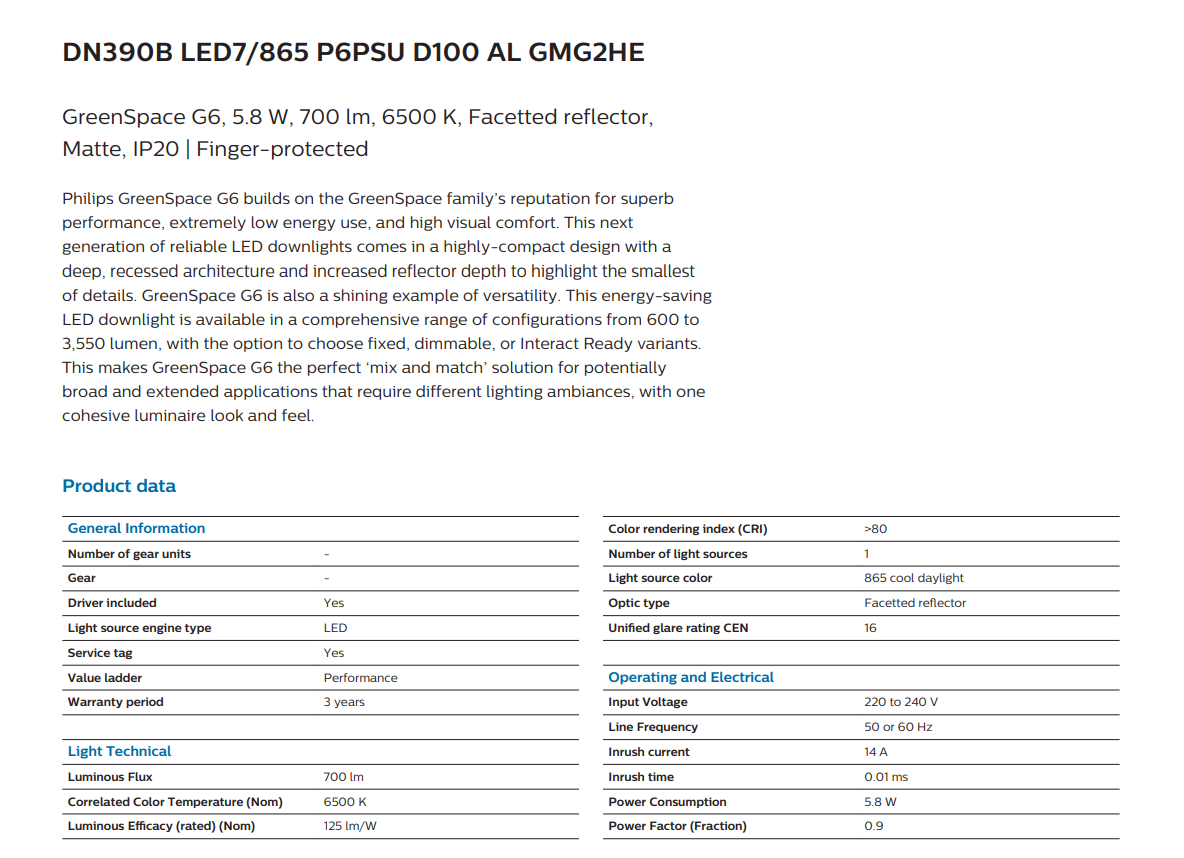 The PHILIPS DN390B GREENSPACE G6 LED7/865 DOWNLIGHT 6500K COOL DAYLIGHT 240V 5.8W 700LM IP20 CRI80 (911401535844) is an ideal choice for users seeking a cost-effective, energy-saving, and high-quality downlight from Philips.