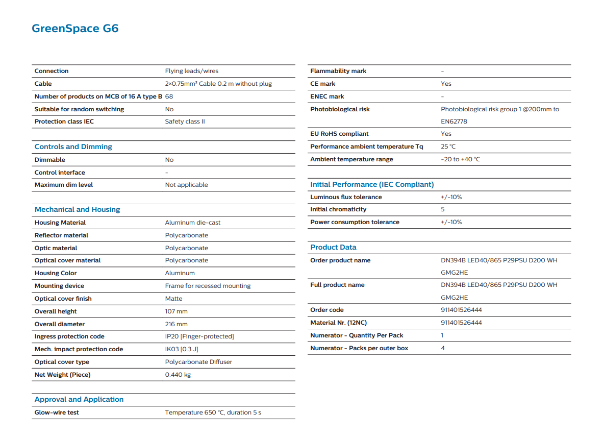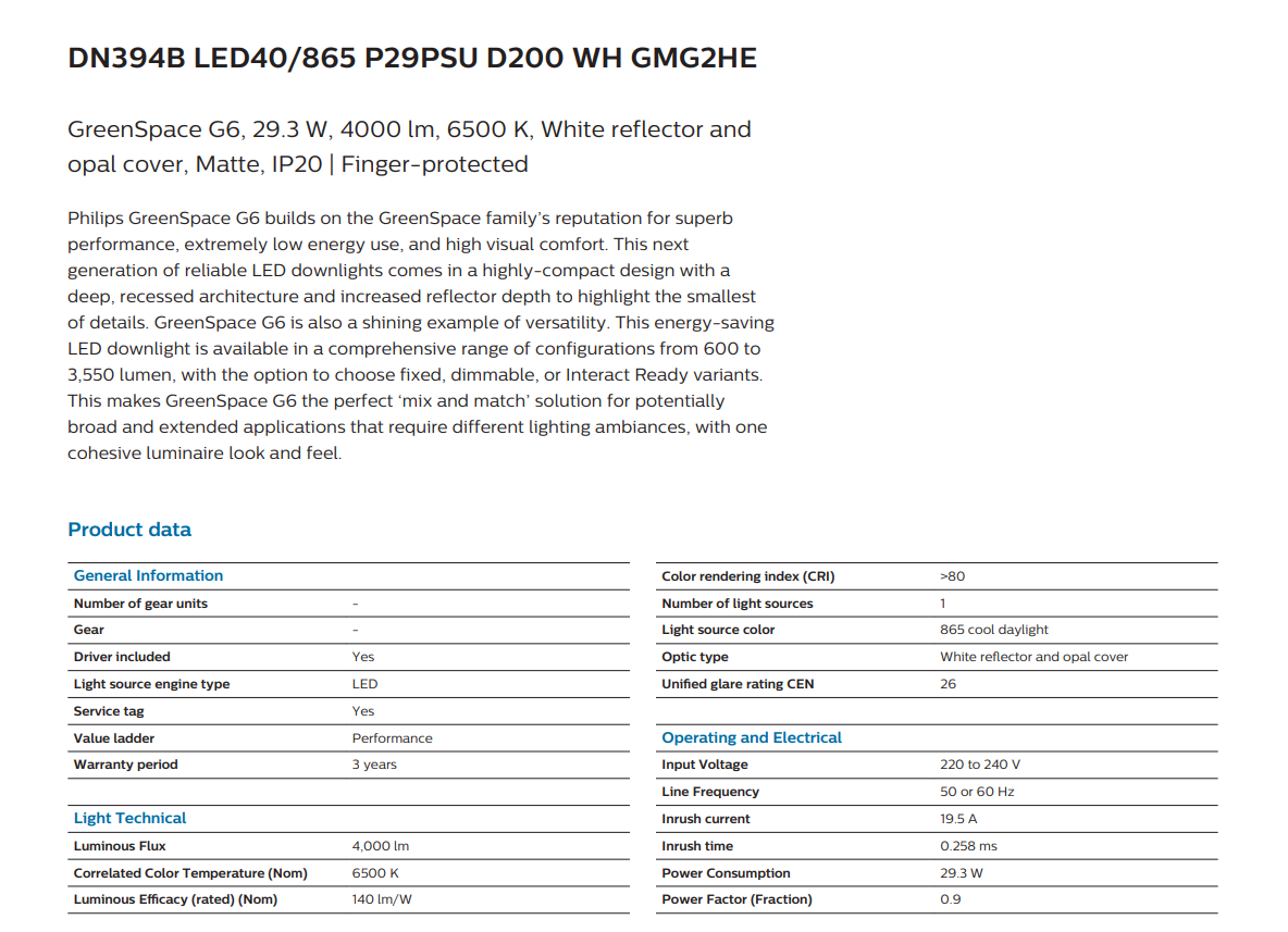 The PHILIPS DN394B GREENSPACE G6 LED40/865 DOWNLIGHT 6500K COOL DAYLIGHT 240V 29.3W 4,000LM 50,000HRS IP20 CRI80 (911401526444) is the perfect choice for users seeking high brightness, energy efficiency, and dependable Philips quality.