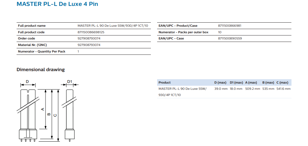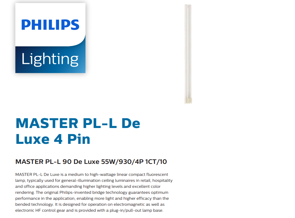 Philips is a trusted global leader in lighting solutions. The MASTER PL-L DE LUXE series is specifically engineered for applications requiring superior light quality, making it a reliable choice for professionals who demand performance, efficiency, and durability.