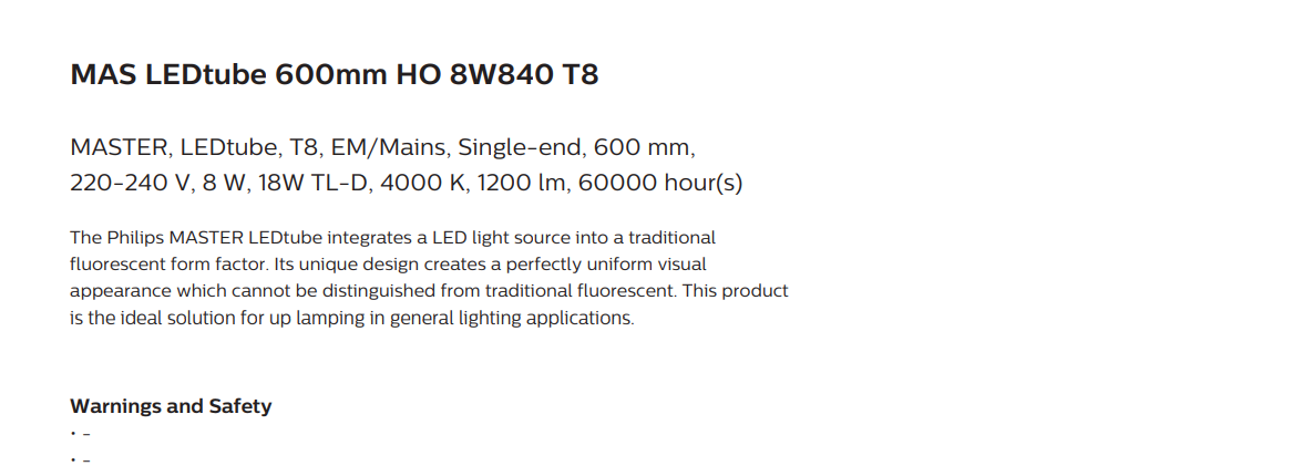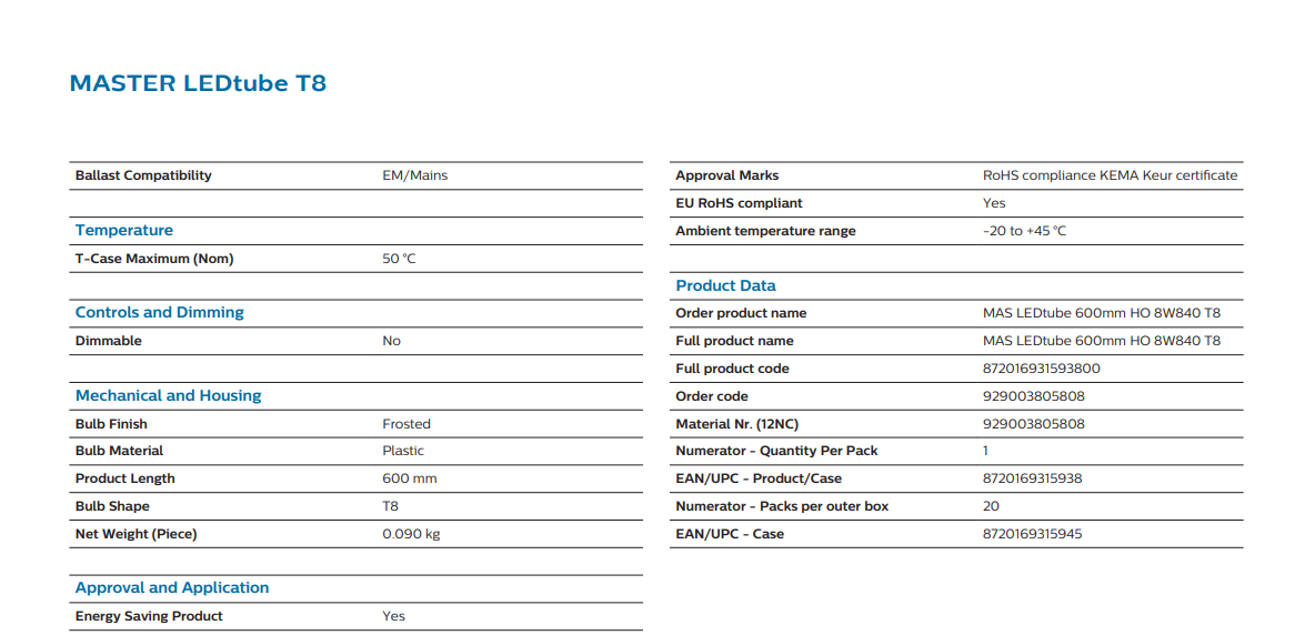 The PHILIPS MASTER LED T8 600MM 8W 1200LM 4000K is the perfect upgrade for users looking for energy efficiency, durability, and trusted Philips lighting quality.