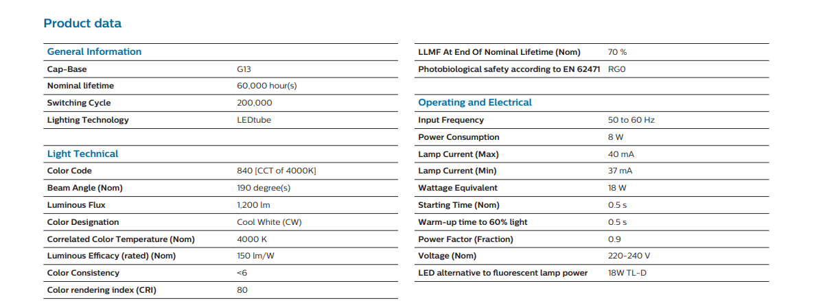 Operating at 220–240V, this LED tube consumes only 8W while delivering 1,200 lumens, making it an excellent replacement for traditional 18W TL-D fluorescent tubes. The 4000K cool white colour temperature provides balanced, comfortable lighting—ideal for offices, retail environments, and general indoor use.