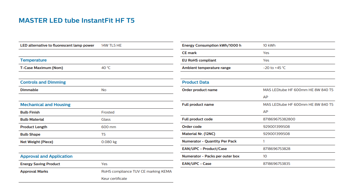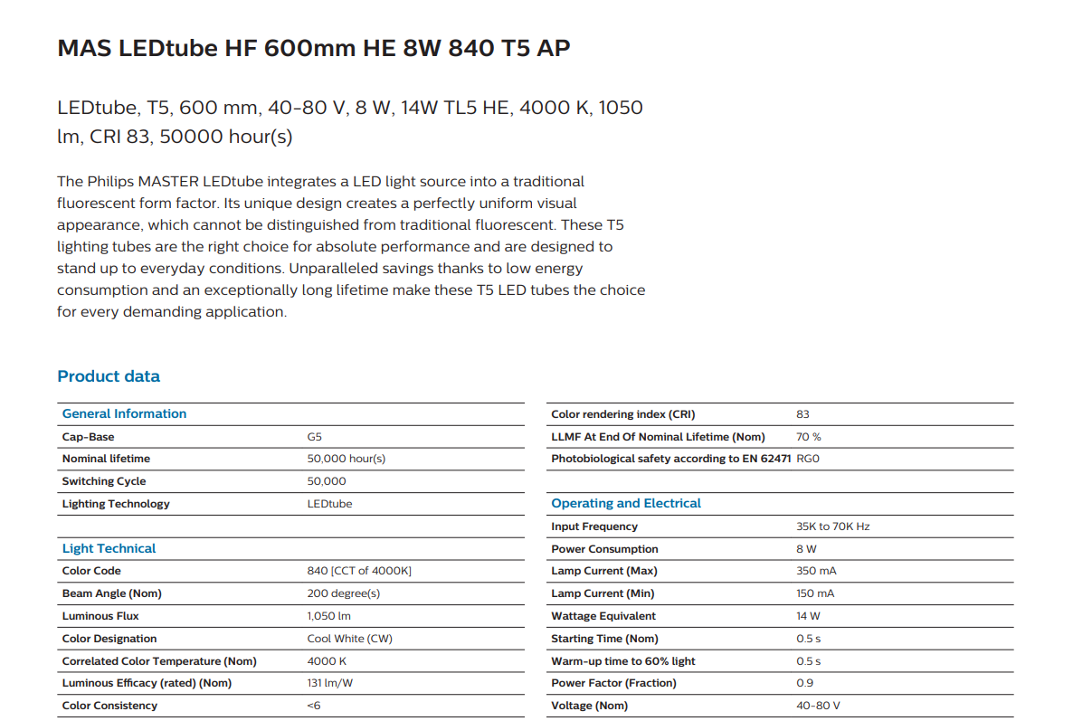 The PHILIPS MASTER LED TUBE INSTANTFIT HF T5 4000K COOL WHITE G5 80V 8W 1,050LM 50,000HOURS CRI80 600MM (LEDTUBE TL5 HE 14W REPLACEMENT) [929001399508] is a high-efficiency lighting solution designed for seamless upgrade from conventional fluorescent T5 tubes. As part of the PHILIPS LED TUBES category, this InstantFit HF model delivers reliable performance, energy savings, and long service life.