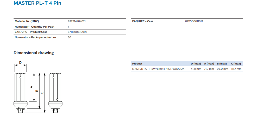 PHILIPS MASTER PLT 4PIN FLUORESCENT TUBE 18W 1150LM 4000K CRI80 (927914484071)