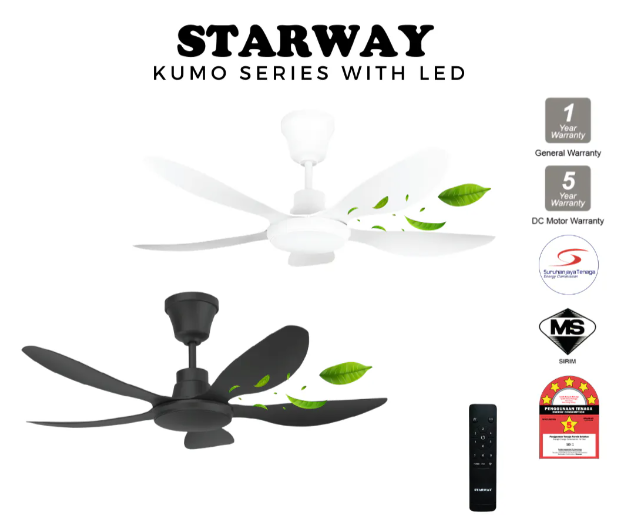 The STARWAY KUMO SERIES 42'' 5 BLADES BABY CEILING FAN WITH REMOTE CONTROL 39W [BLACK/WHITE] is a compact and stylish cooling solution designed to deliver efficient airflow and modern convenience. Perfect for smaller rooms such as bedrooms, study areas, apartments, and offices, this 42-inch ceiling fan combines performance with a sleek, space-saving design.
