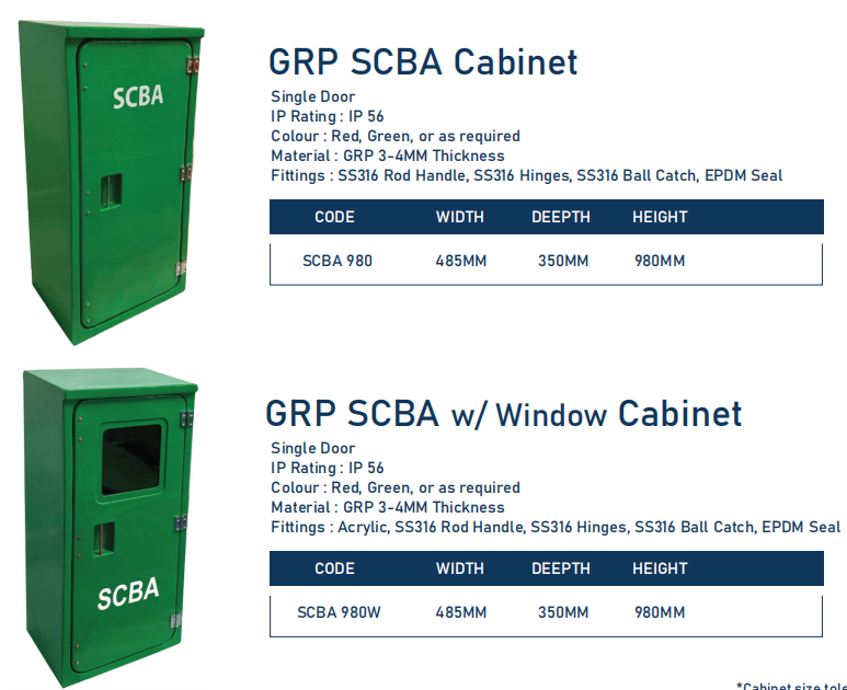 Joncan Composites SCBA 980 Breathing Apparatus Cabinet is engineered to store 1 x 30-60 Minute Self-Contained Breathing Apparatus (SCBA) and 1 spare cylinder. Manufactured with Lloyds-approved composites including UV-resistant gelcoats, it delivers long-lasting protection in harsh environments, backed by an IP56 rating and dual Lloyds & ABS approvals. Its proven design balances high rigidity and low weight, with an effective EPDM door seal and 316 stainless steel hinges secured by matching nuts, bolts and washers. Available in left/right hinging, it features a 316 stainless steel rod handle for quick emergency access (even with gloves); the SCBA is held by a sprung clip and the spare cylinder by a quick-release nylon strap, ensuring secure storage and fast retrieval in emergencies.