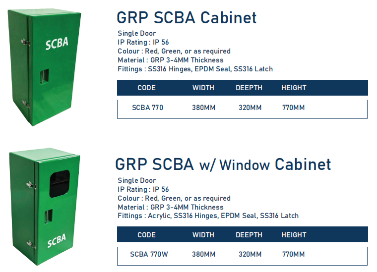 Joncan Composites SCBA 980 Breathing Apparatus Cabinet is engineered to store 1 x 30-60 Minute Self-Contained Breathing Apparatus (SCBA) and 1 spare cylinder. Manufactured with Lloyds-approved composites including UV-resistant gelcoats, it delivers long-lasting protection in harsh environments, backed by an IP56 rating and dual Lloyds & ABS approvals. Its proven design balances high rigidity and low weight, with an effective EPDM door seal and 316 stainless steel hinges secured by matching nuts, bolts and washers. Available in left/right hinging, it features a 316 stainless steel rod handle for quick emergency access (even with gloves); the SCBA is held by a sprung clip and the spare cylinder by a quick-release nylon strap, ensuring secure storage and fast retrieval in emergencies.