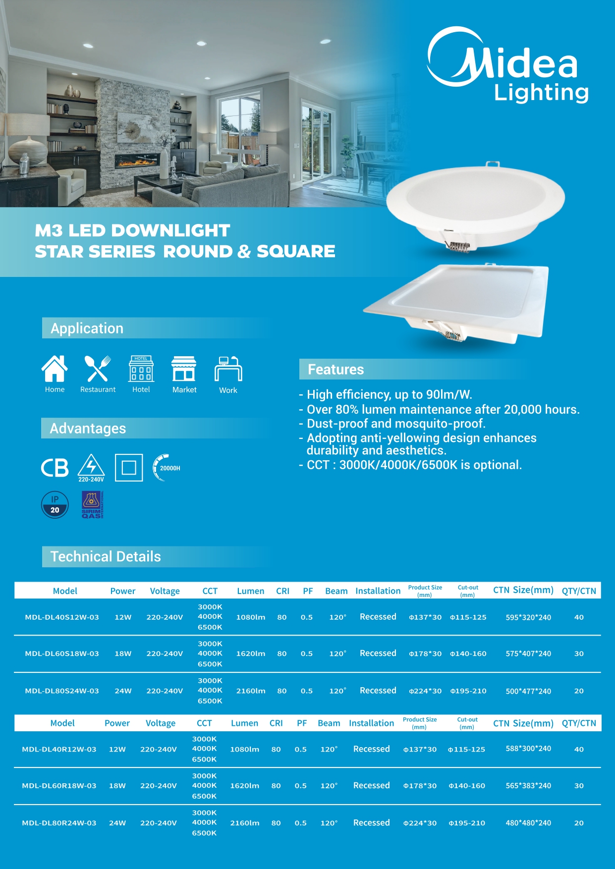 Operating at 240V, the MIDEA M3 Star Series ensures stable performance and energy efficiency. Its CRI80 rating provides reliable color rendering for everyday lighting, while the long lifespan of up to 20,000 hours reduces maintenance and replacement frequency. Designed with an IP20 rating, it is ideal for indoor use in residential, office, and retail environments.