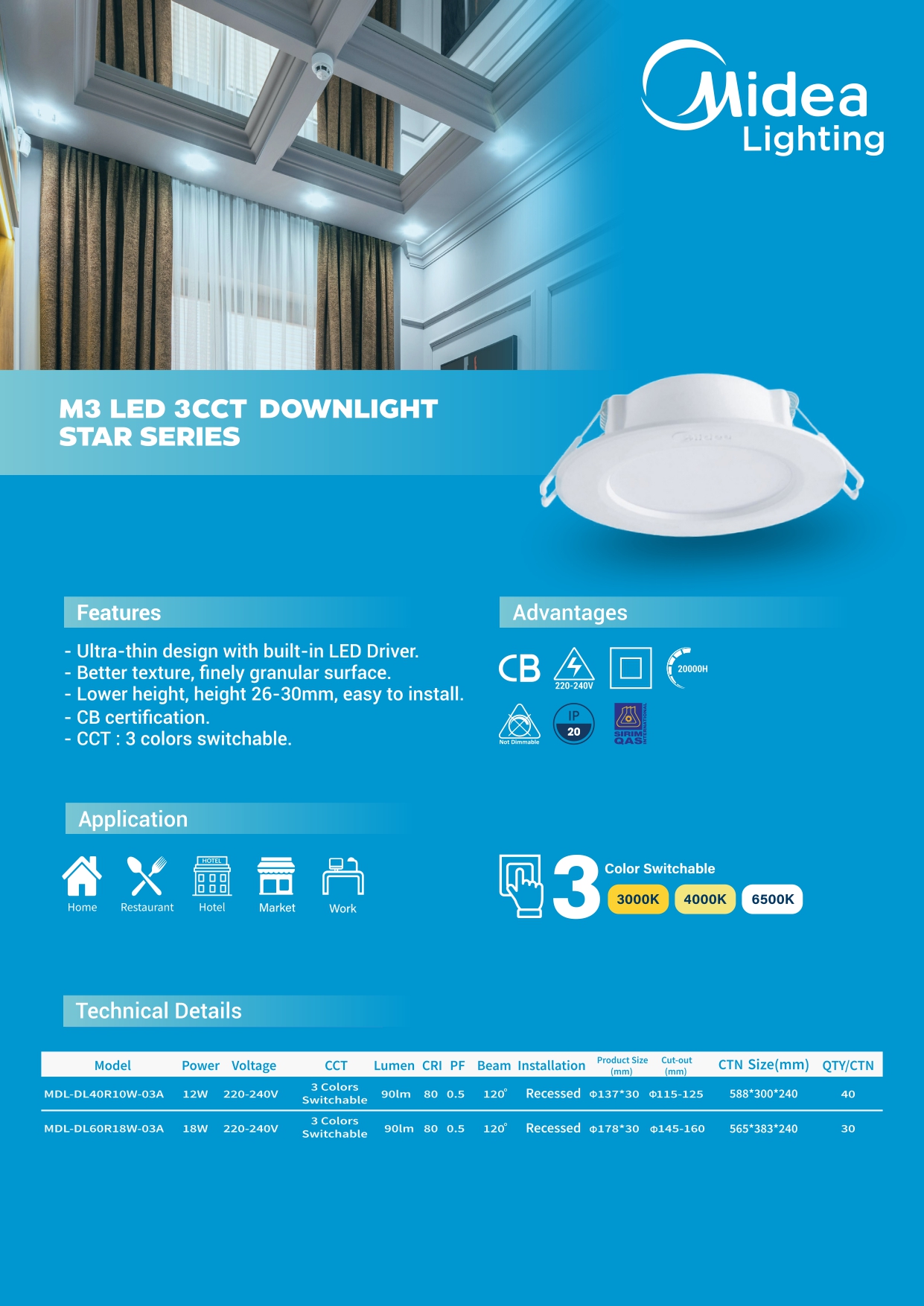 Built with durability in mind, the MIDEA M3 Star Series offers a long lifespan of up to 20,000 hours, reducing maintenance and replacement frequency. With a CRI80 rating, it provides reliable and natural color rendering suitable for everyday lighting needs. The IP20 rating ensures it is well-suited for indoor applications.