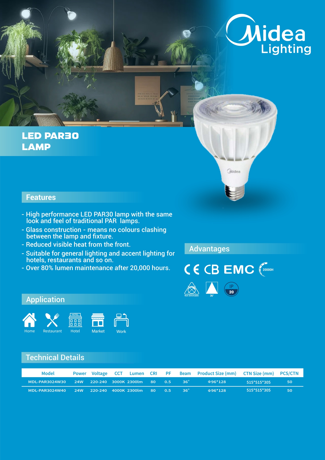 The MIDEA LED PAR30 BULB 240V 24W 2300LM 20,000HRS IP20 CRI80 [3000K/4000K] is a high-performance lighting solution designed for powerful and focused illumination in both residential and commercial settings. With its PAR30 design, this LED bulb is ideal for spotlighting, track lighting, and accent lighting applications.