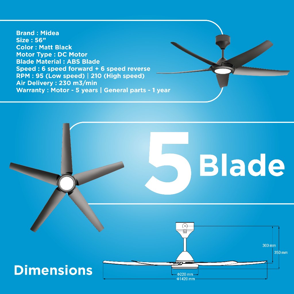 Upgrade your home with the MIDEA DECORATIVE LED CEILING FAN 5 BLADES 3CCT C/W REMOTE CONTROL [42''/56''] [BLACK/WHITE/WALNUT/MAPLE], a perfect blend of modern design, efficient cooling, and customizable lighting. Designed for both style and functionality, this ceiling fan features an integrated LED light with 3CCT adjustable colour temperature, allowing you to switch between warm, neutral, and cool lighting using the included remote control.