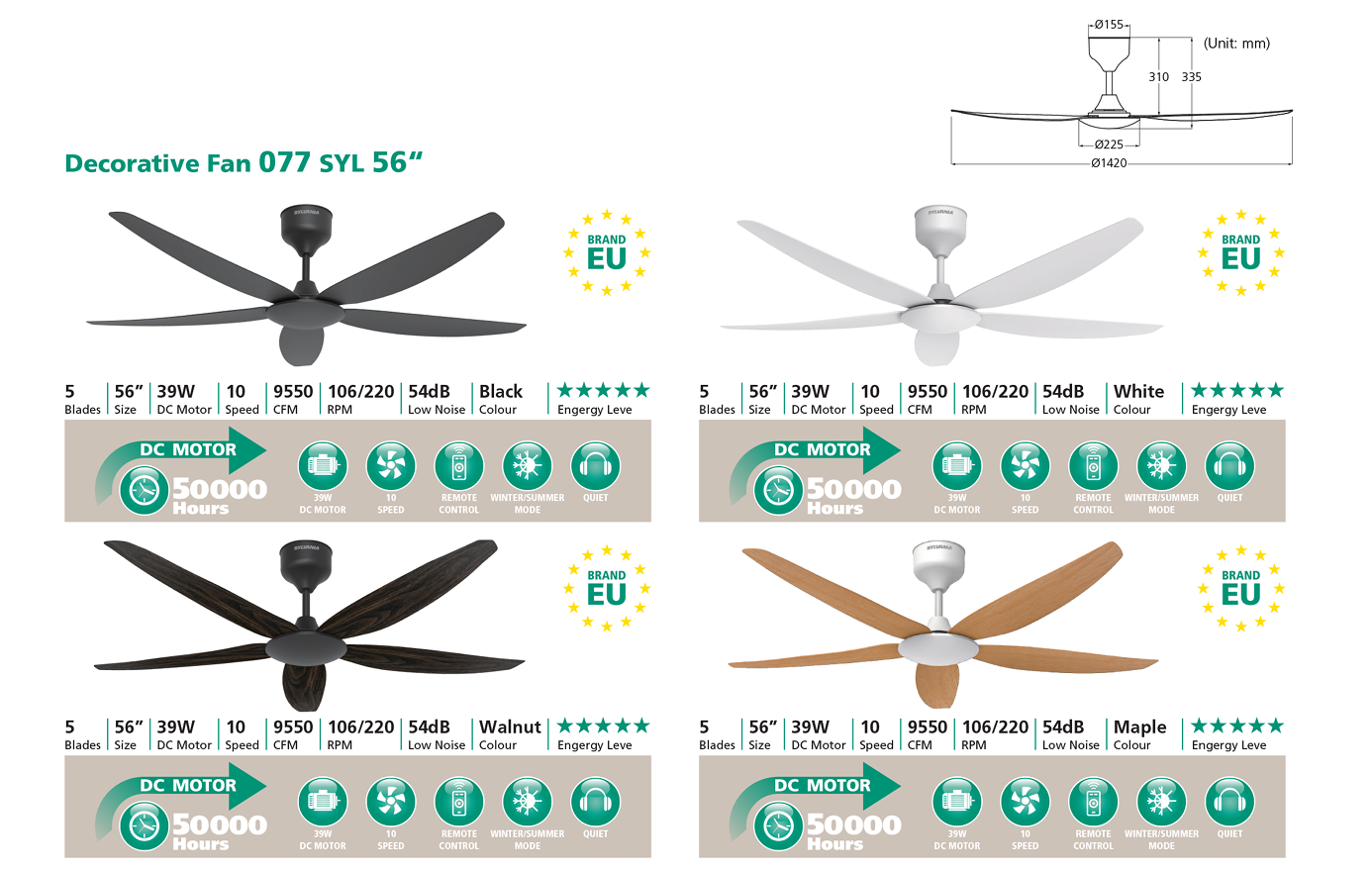 Upgrade your cooling experience with the SYLVANIA 077 DECORATIVE CEILING FAN 5 BLADES C/W REMOTE CONTROL 56'' 39W [BLACK/WHITE/WALNUT/MAPLE] (SIRIM APPROVED), a powerful and stylish ceiling fan designed for larger living spaces. With its wide 56-inch blade span and aerodynamic 5-blade design, this fan delivers strong, even airflow to keep your environment cool and comfortable.