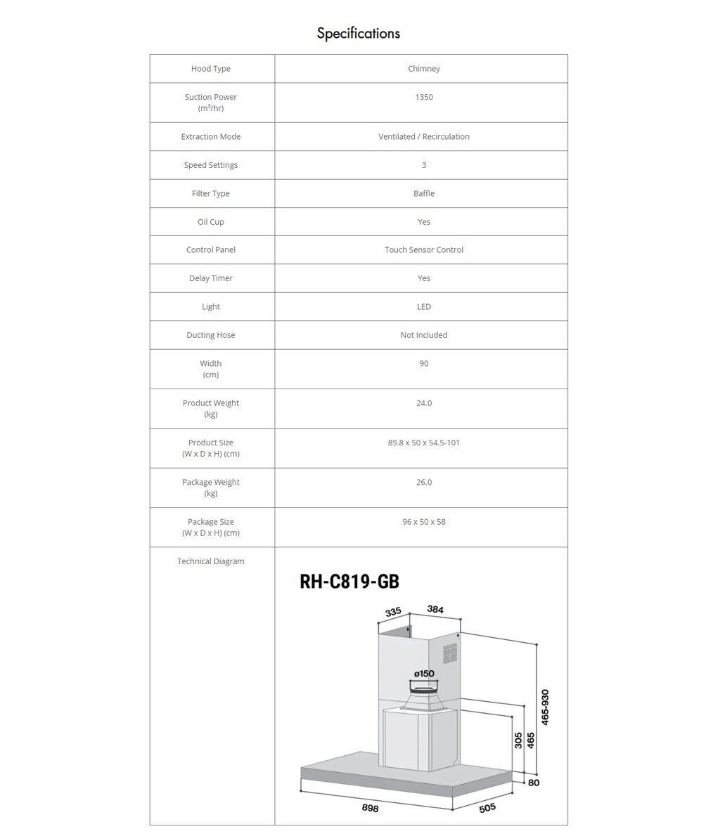 THE KUTCHENHAUSS DESIGN SDN. BHD. Products RINNAI - 90cm Chimney Cooker Hood | RH-C819-GB