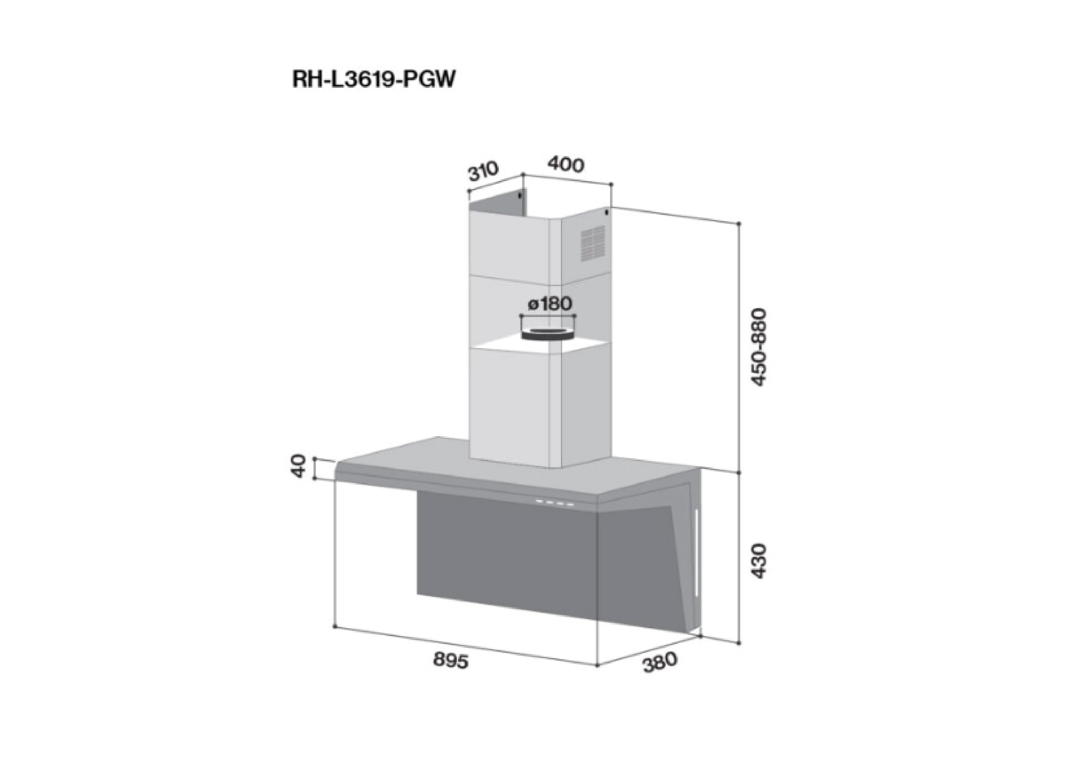 RH-L3619-PGW 90cm L shape Hood Key Features: 1,800m³/hr Suction Power DC Inverter Motor Ozone Disinfection Heat Clean 3 Speed Settings + Booster Delay Timer Wave Control L...