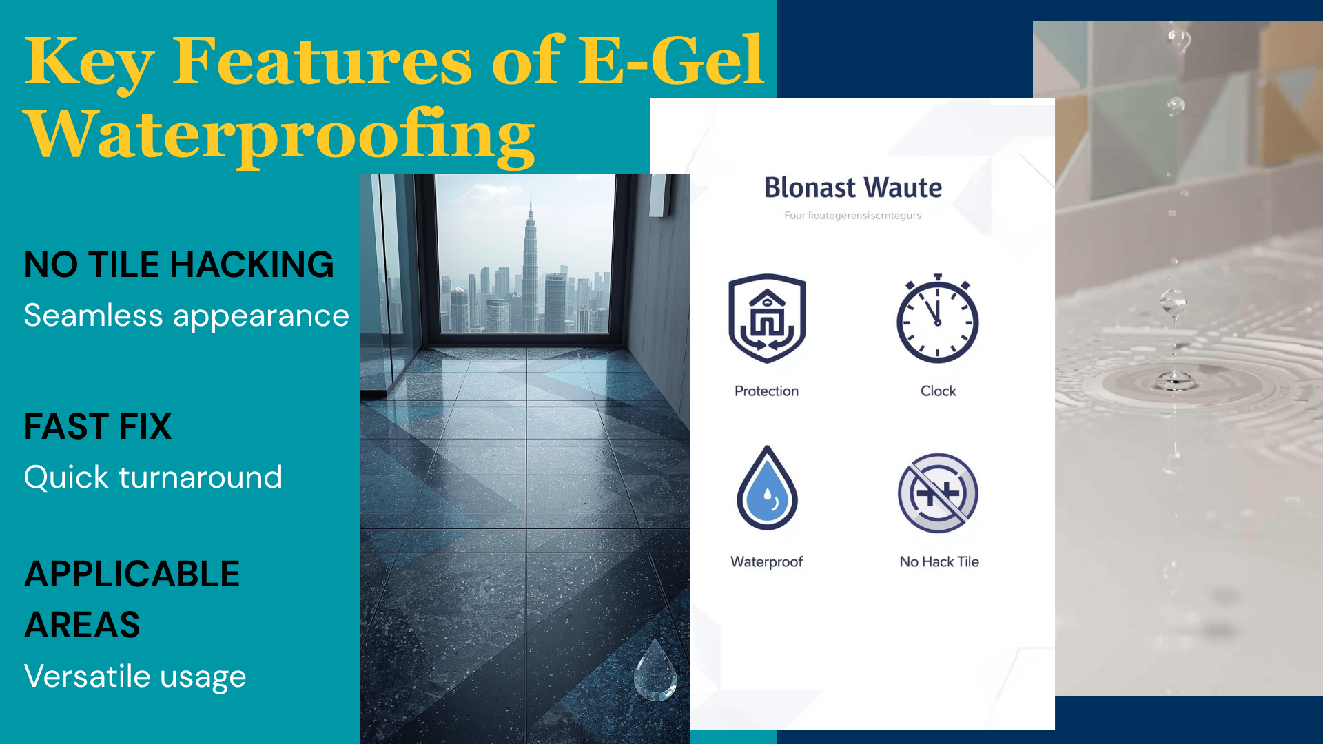 E-Gel is one of the most advanced no-hack waterproofing solutions available to Malaysian homeowners. Offered by HIN Group, E-Gel is a proprietary waterproofing gel system specifically designed for bathrooms, balconies, and other tiled areas where water seepage is a common issue. The beauty of E-Gel is that it seals leaks without requiring any tile removal.