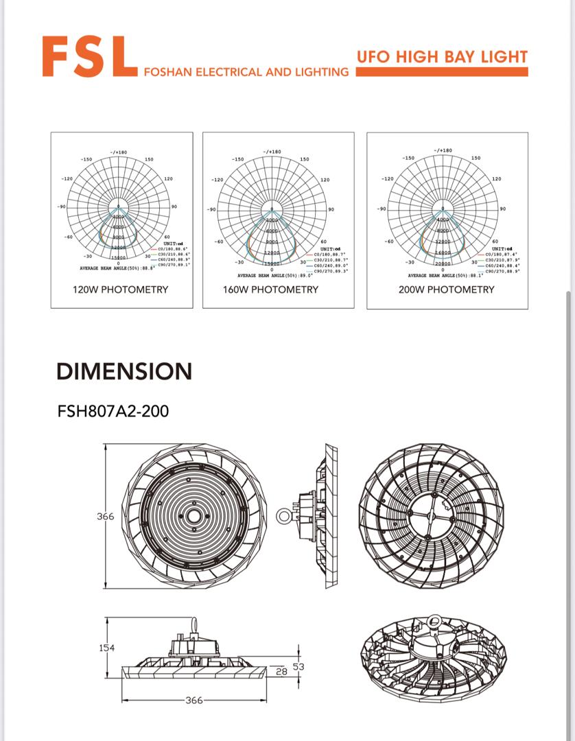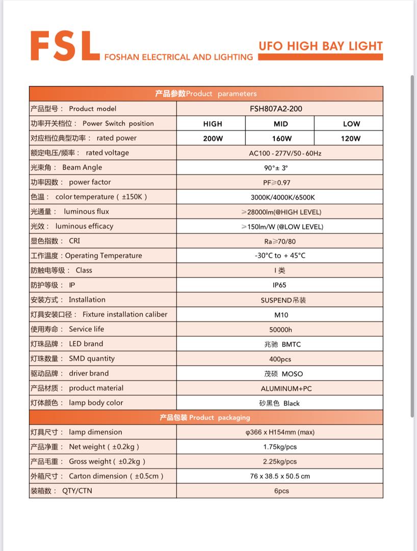 FSL 200W UFO HIGH BAY LIGHT MODEL: FSL807A2-200 COMES WITH ADJUSTABLE POWER SWITCH : 120W, 160W , 200W COMES WITH 3CCT: 3000K, 4000K, 6500K )3 IN 1