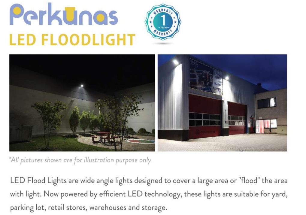 Illuminate outdoor and industrial spaces with the PERKUNAS LED FLOODLIGHT 240V 20,000HRS IP66 CRI70 [30W/50W/100W/150W/200W] [3000LM/5000LM/10000LM/15000LM/20000LM] (SIRIM APPROVED) [3000K/4000K/6500K], a powerful and energy-efficient lighting solution designed for long-term, heavy-duty use.