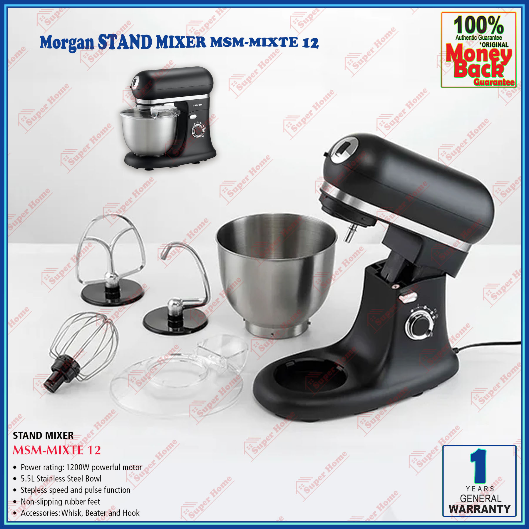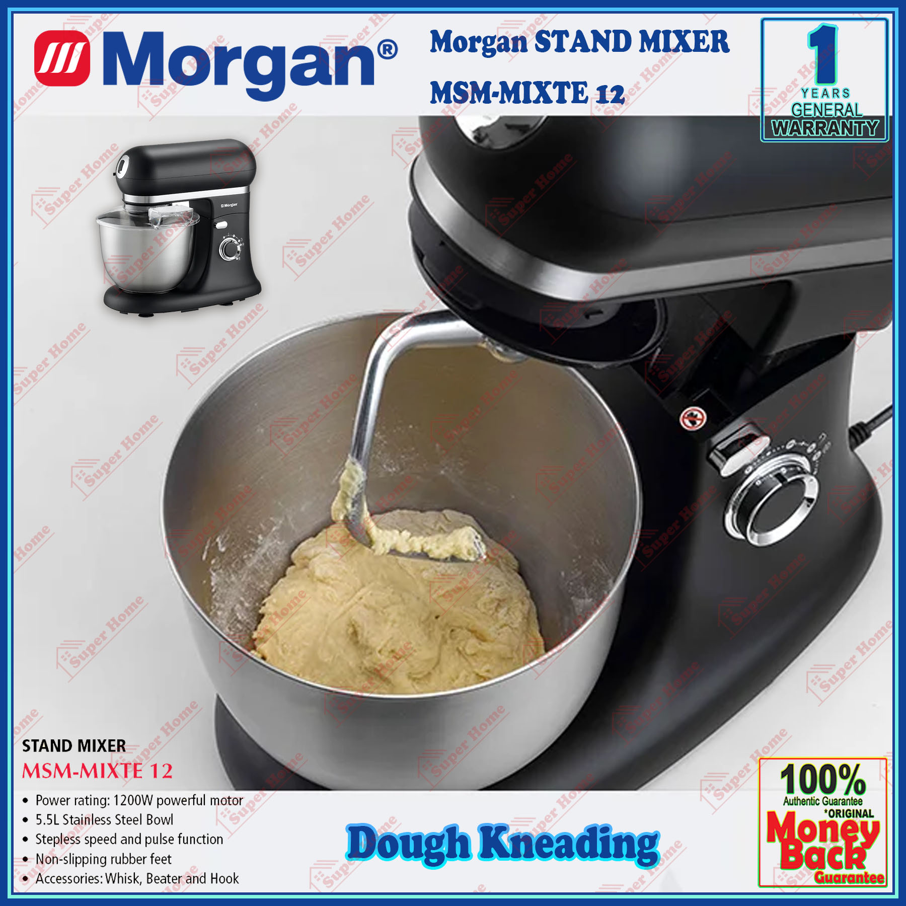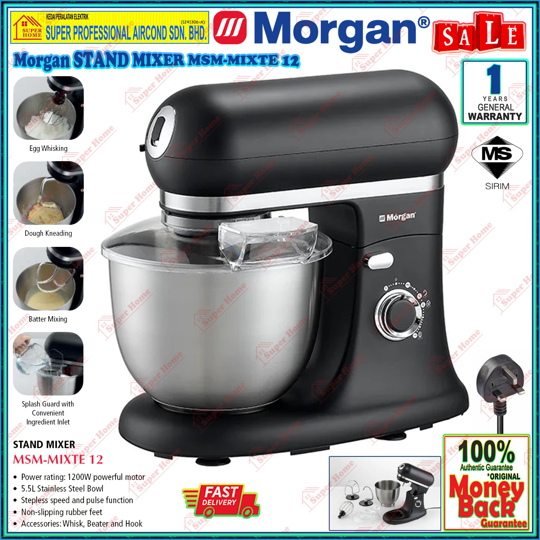 Super Professional Aircond Sdn Bhd Products Morgan Stand Mixer MSM-MIXTE12 Power Stand Mixer 1200W (5.5L Stainless Steel Bowl)