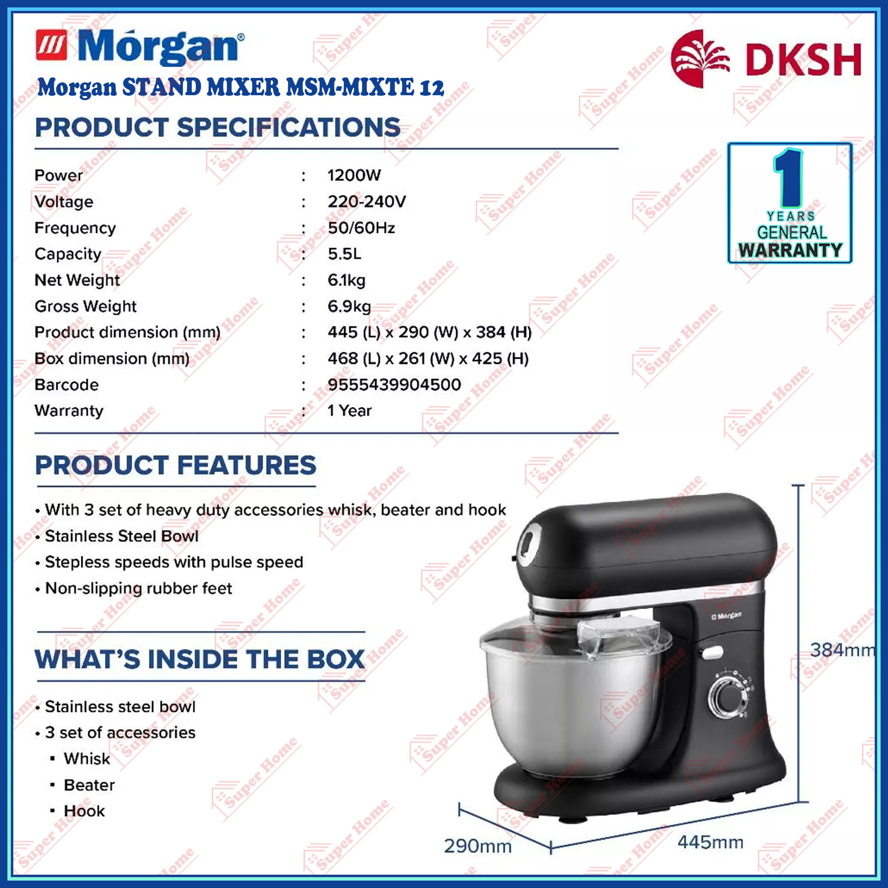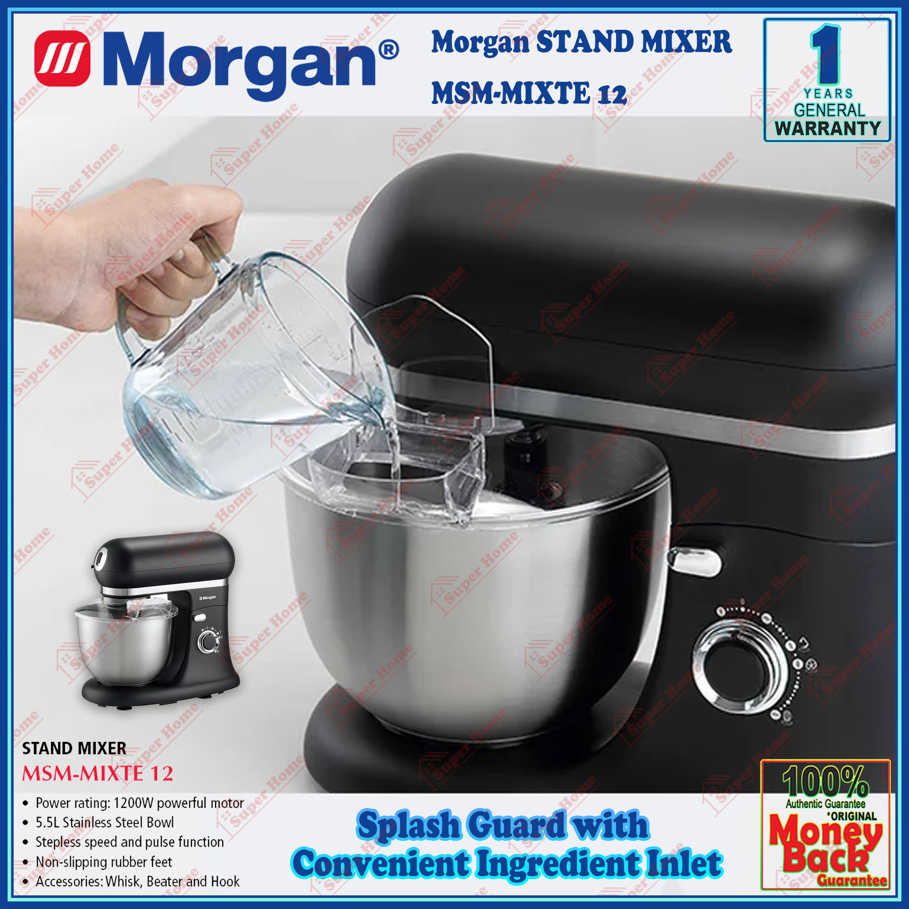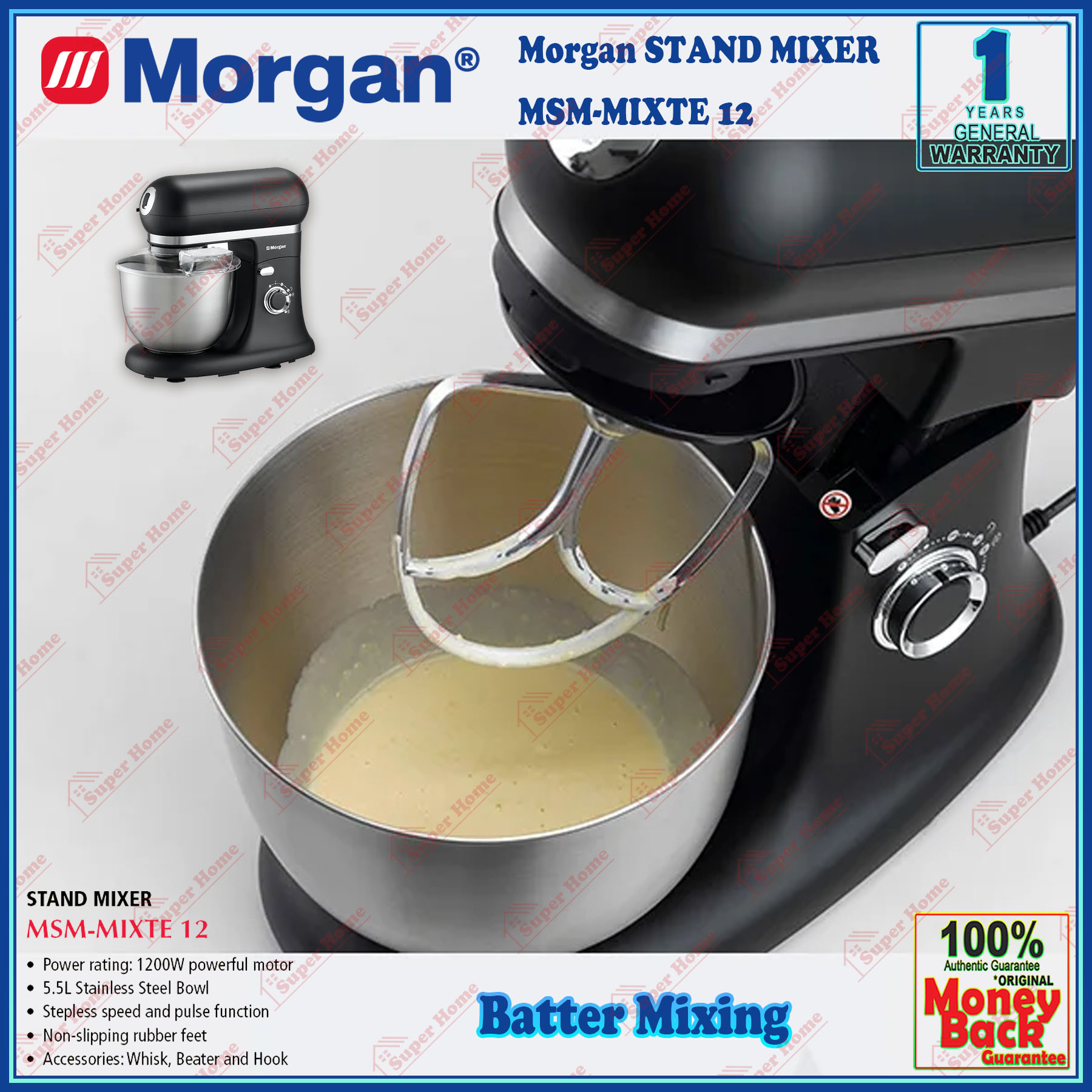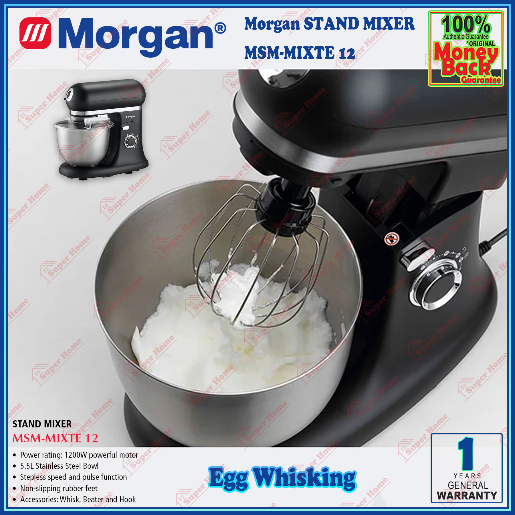 Super Professional Aircond Sdn Bhd Products Morgan Stand Mixer MSM-MIXTE12 Power Stand Mixer 1200W (5.5L Stainless Steel Bowl)