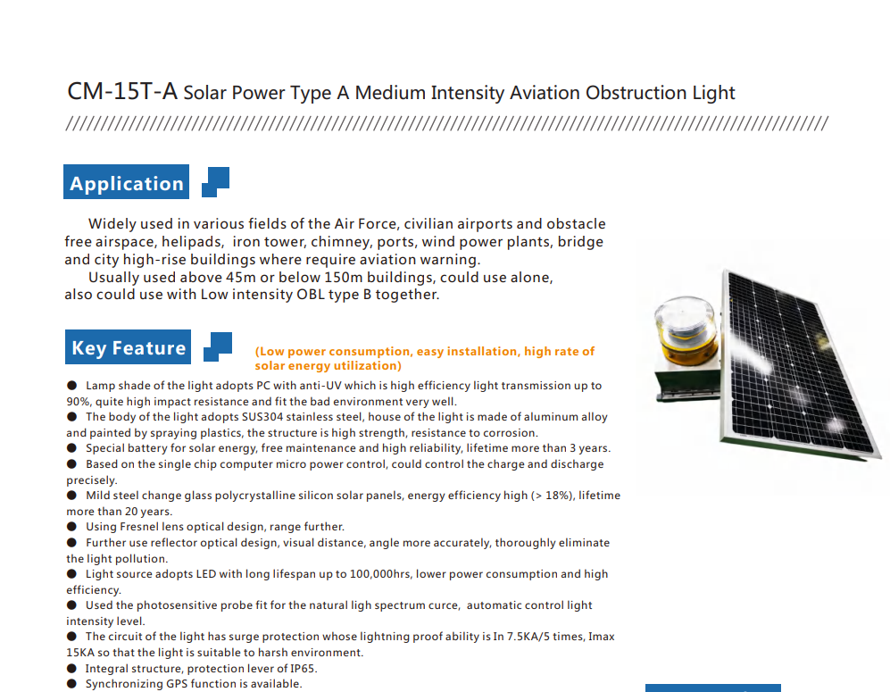 Enhance aviation safety and ensure regulatory compliance with the JLUX CM-15T-A SOLAR POWER TYPE A MEDIUM INTENSITY LED AVIATION OBSTRUCTION LIGHT 20W 100,000HOURS IP65 (WHITE). Manufactured under JLUX (OEM), this high-performance solar-powered obstruction light is specifically designed for high-rise buildings, communication towers, wind turbines, chimneys, bridges, and other elevated structures requiring reliable aviation warning systems.