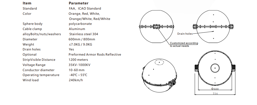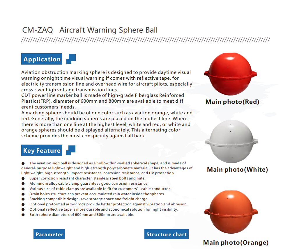 With bright colour options in Orange, Red, and White, the sphere ball enhances contrast against various backgrounds, ensuring maximum visibility from the air. Its lightweight yet robust construction allows for secure mounting on overhead cables and transmission lines, making it ideal for aviation safety compliance in infrastructure and utility projects.