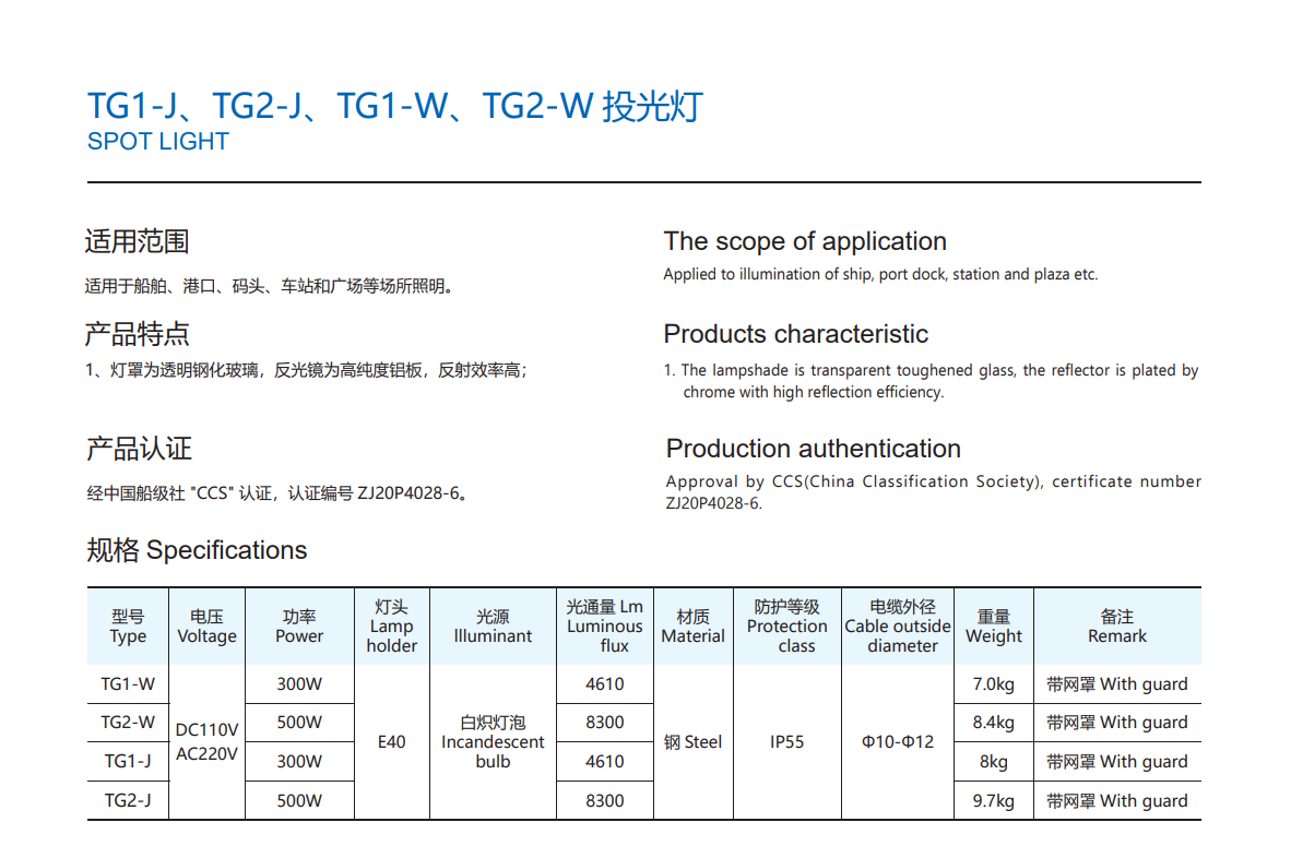The JLUX Marine Offshore Spotlight Fitting Only E40 Incandescent Bulb IP55 [300W/500W] [4,610LM/8,300LM] [TG1-W/TG2-W/TG1-J/TG2-J] is a heavy-duty lighting solution designed for marine vessels, offshore platforms, and industrial marine environments. Built with durable construction and reliable performance, this spotlight is suitable for demanding offshore conditions where strong and focused illumination is required.