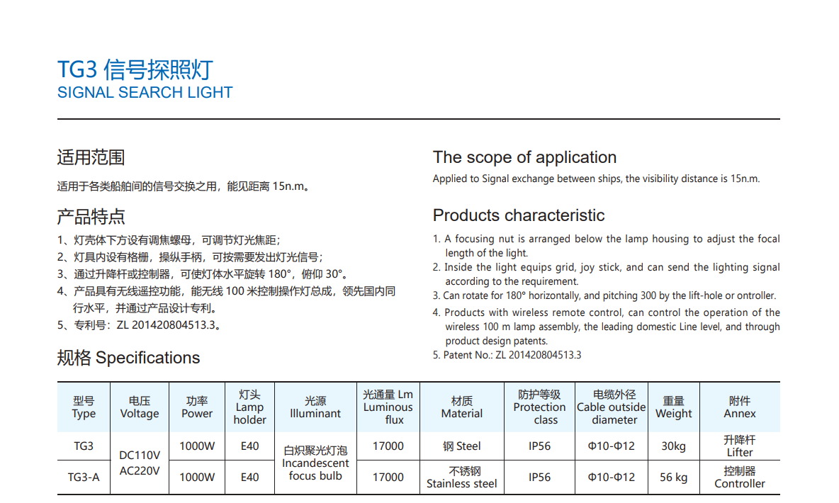 Equipped with an E40 incandescent focus bulb holder, this search light supports 1000W high-intensity lamps, producing up to 17,000 lumens for excellent long-range visibility. The IP56 protection rating ensures resistance against dust and powerful water splashes, making it ideal for use in harsh marine conditions.