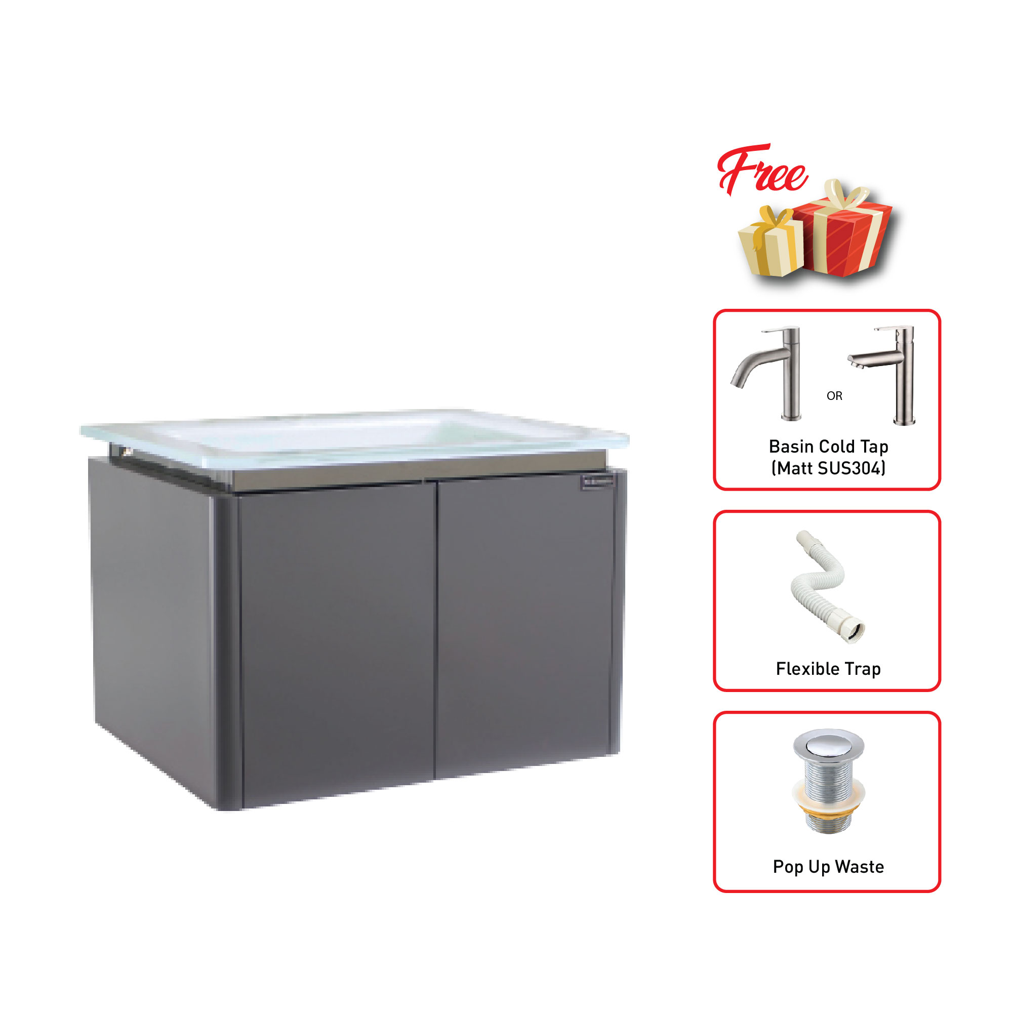Duvena 600mm Glass Top Basin Cabinet (DC613) Basin Cabinet Size: (W)600 x (D)480 x (H)440 mm Colour: Grey INCLUDE : Basin Cold Tap (MATT SUS304) Pop Out Waste W/O Overflow Flexible Trap ...