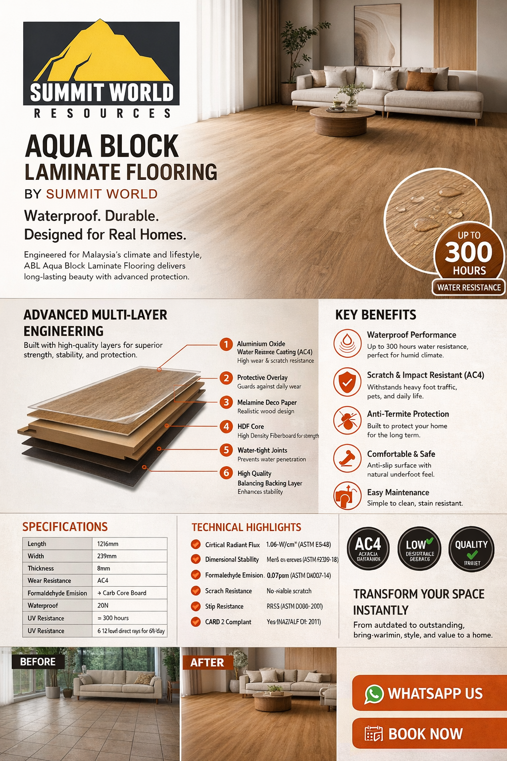 Introducing ABL Aqua Block Laminate Flooring by Summit World — a next-generation laminate flooring solution engineered to handle Malaysia’s humid climate, heavy foot traffic, and modern lifestyle needs.