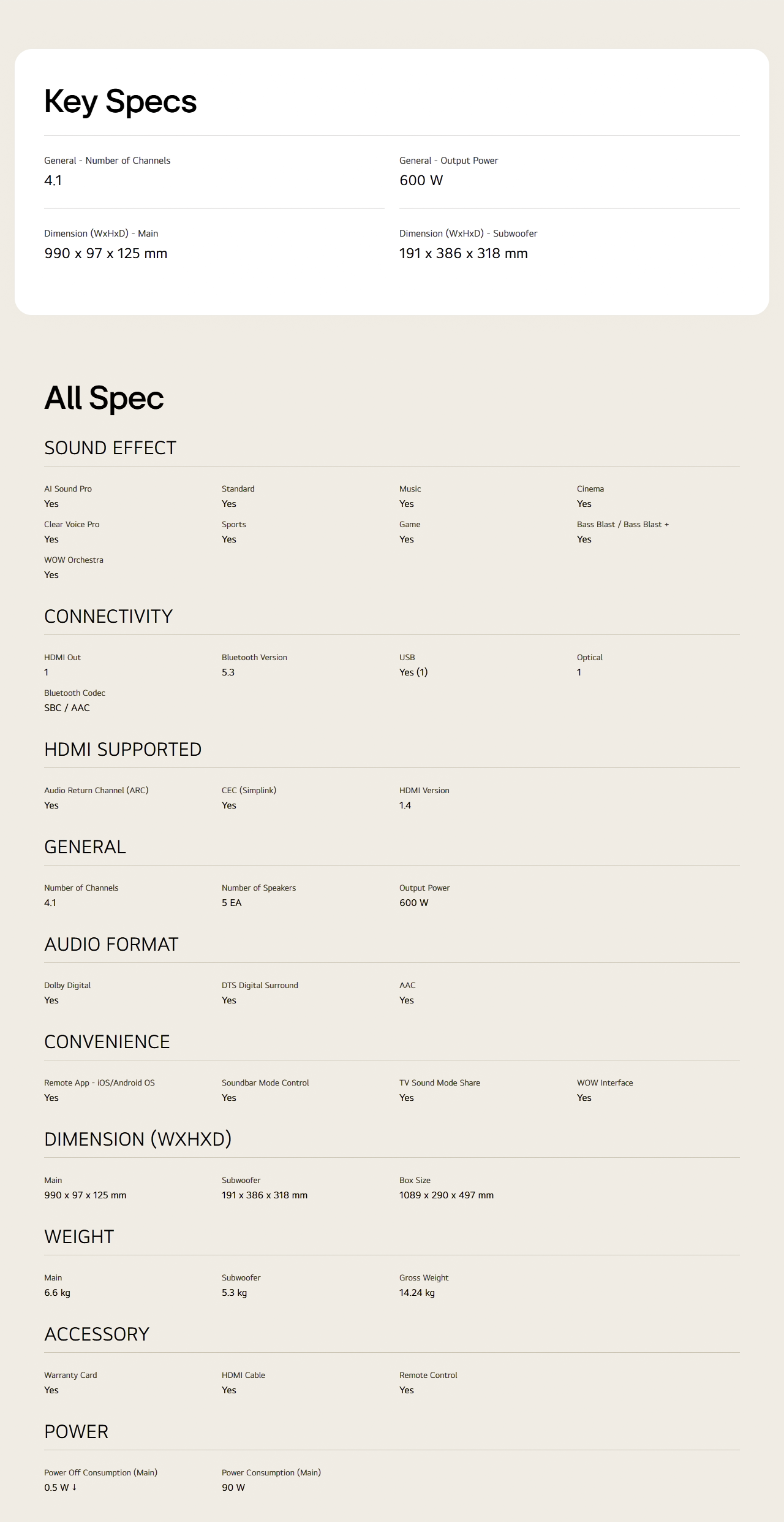 Key Features 4.1 channels with Powerful 600W AI Sound Pro, Dolby Digital, DTS Surround Clear Voice Pro ...