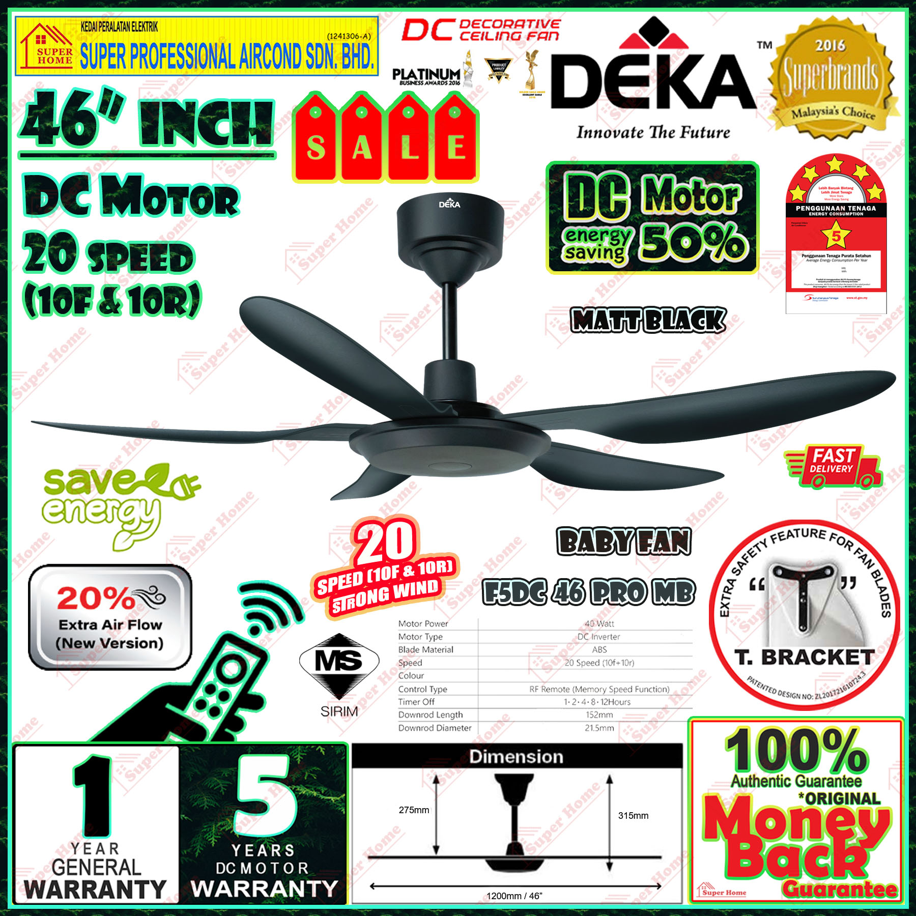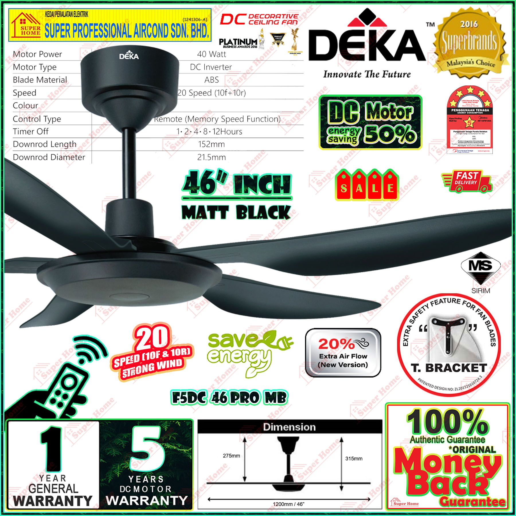 Super Professional Aircond Sdn Bhd Products Deka Baby Fan F5DC 46 PRO MB (Matt Black) 46 Inches 5 Blades Ceiling Fan With Remote Control
