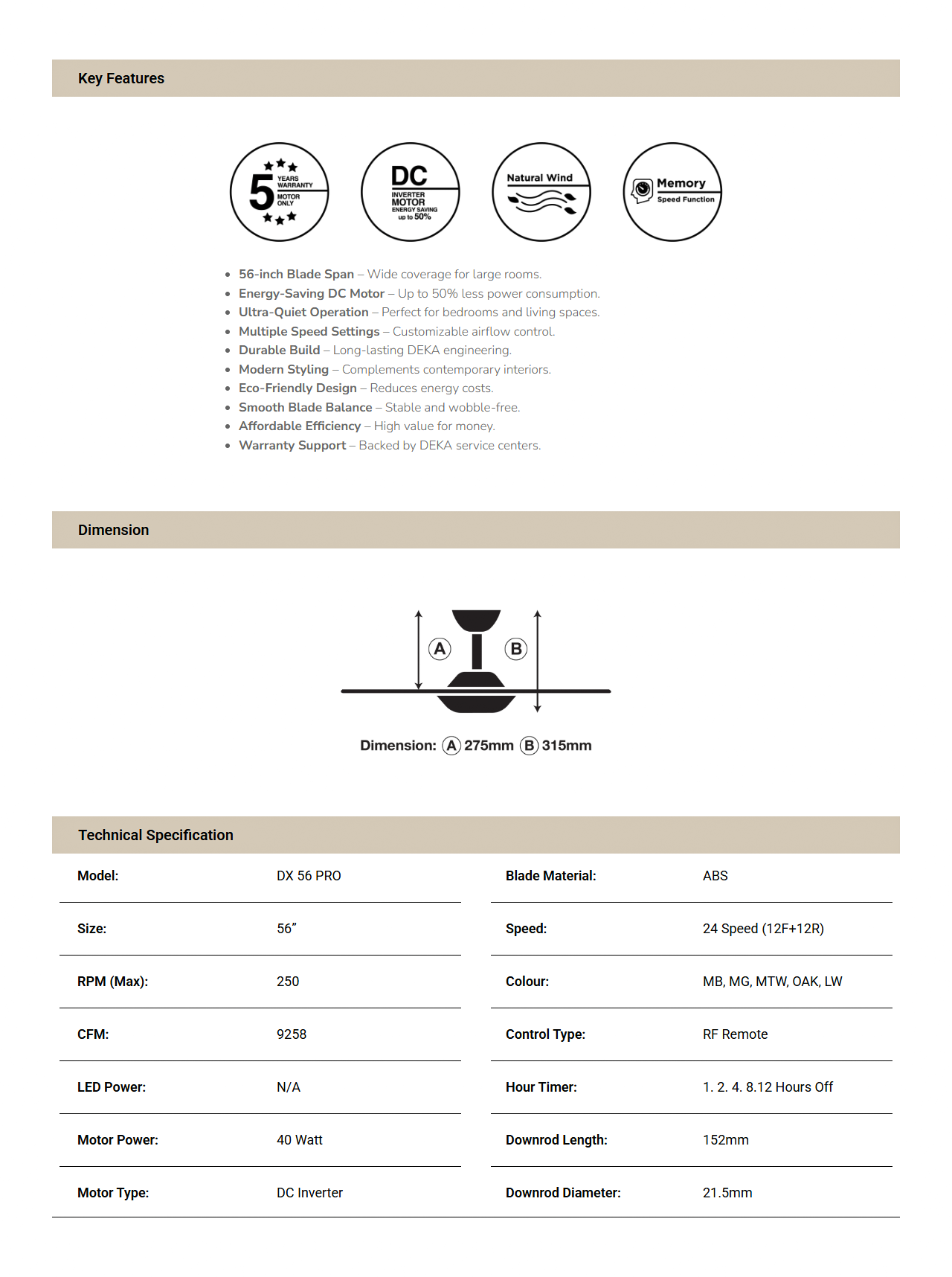 KuangHuat Electronic Sdn Bhd Products DEKA 56-inch Wide Coverage With Energy-Saving DC Motor Ceiling Fan - DX 56 PRO