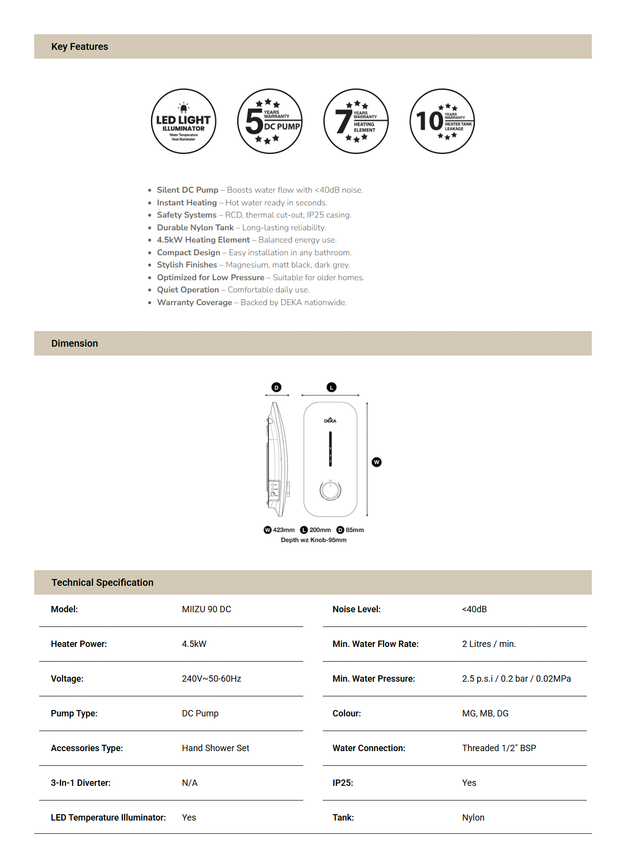 DEKA Silent DC Pump For Powerful Showers Water Heater - MIIZU 90 DC (BK)
